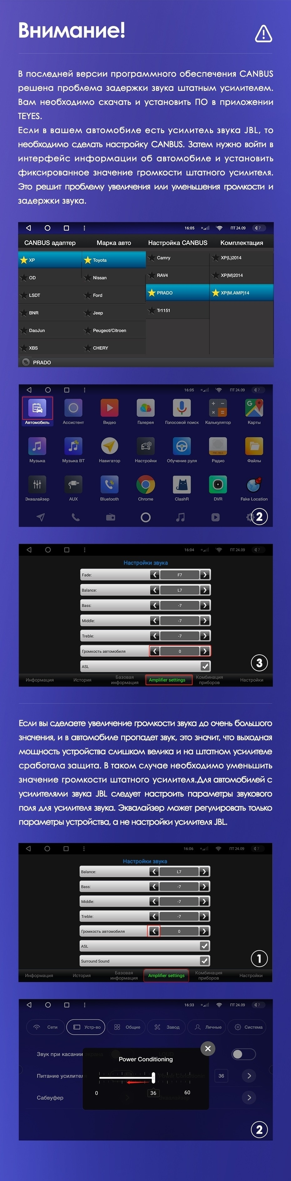Производитель использует только современные технологические и программные решения, что не заставляет ждать результатов. Новинка компании получила объемный звук с широкими возможностями настройки. Любые помехи или задержки в работе магнитолы исключены. Звуковой чип DPS Adau1701 в сочетании с Rohman32107, подключение посредством оптоволоконного кабеля цифровых выходов — все направлено на превосходный звук.