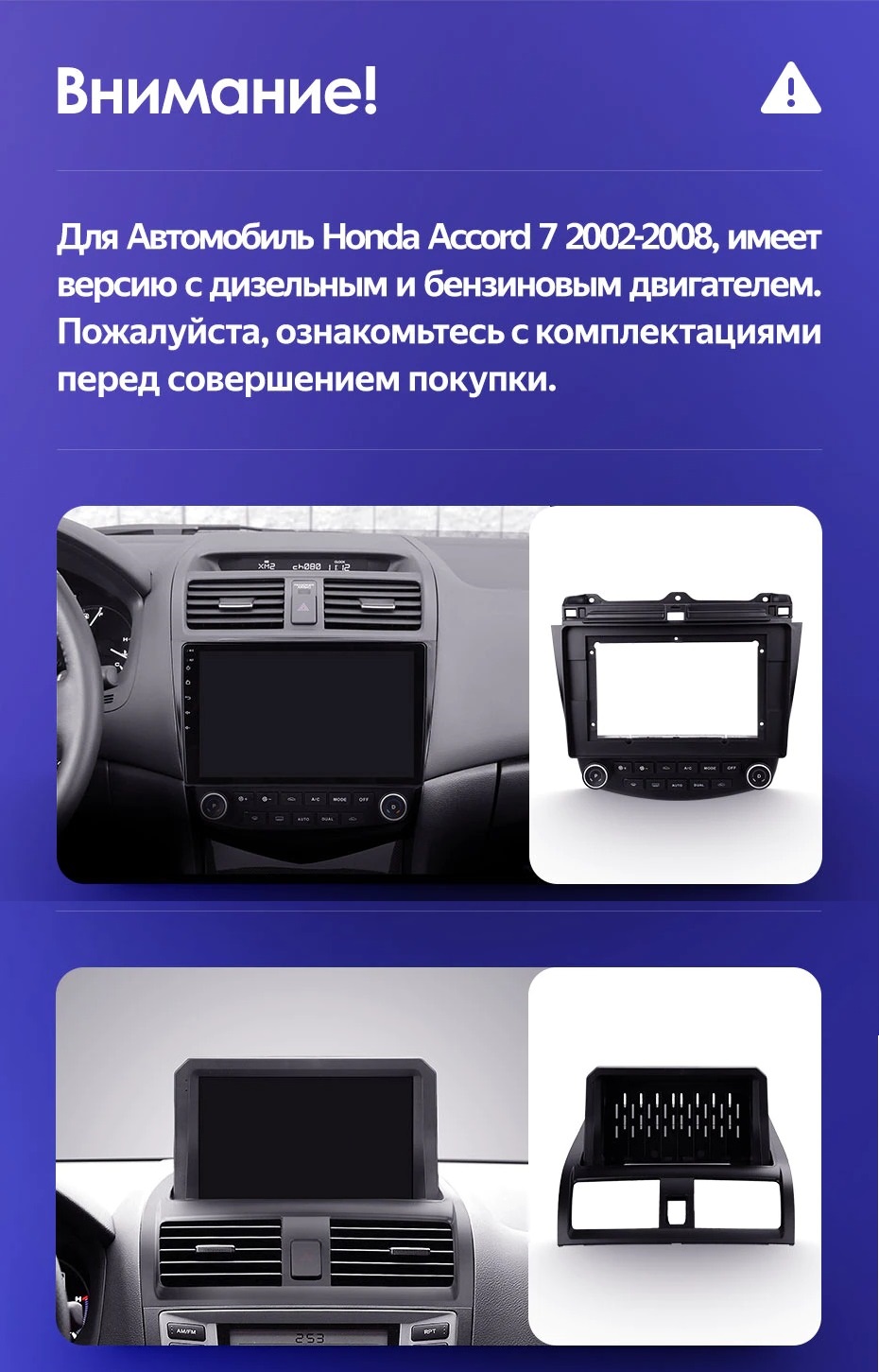 Установочный комплект для Honda Accord 7 (2002-2008) включает переходную рамку и проводку.