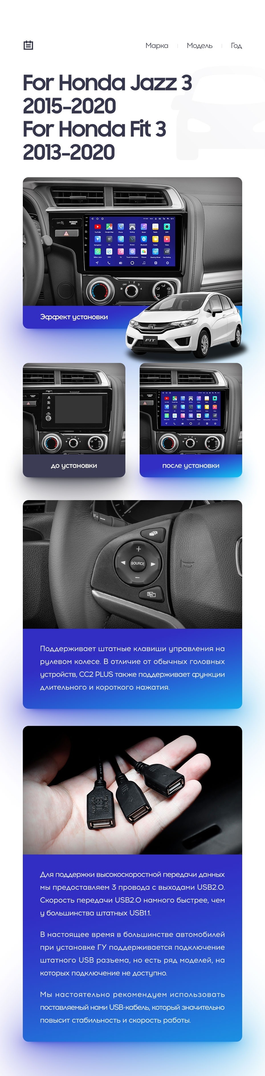 Полный комплект установки магнитолы Teyes с рамкой и проводкой можно выбрать в каталоге штатных магнитол Fit 3 GP GK (2013-2020).