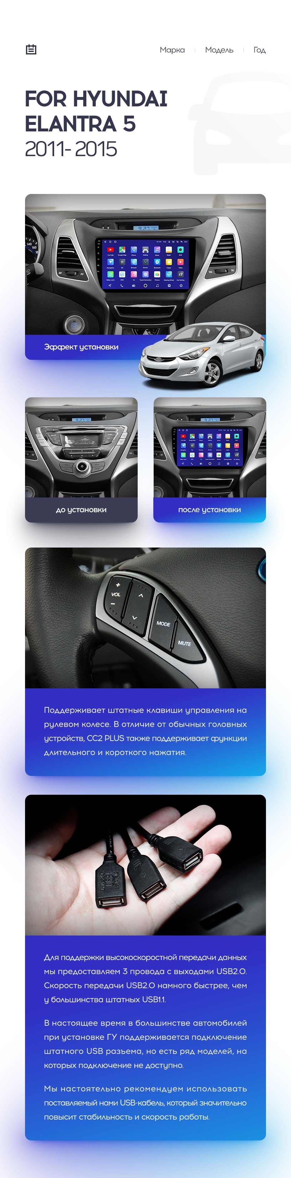 Полный комплект установки магнитолы Teyes с рамкой и проводкой можно выбрать в каталоге штатных магнитол Hyundai Elantra 5 JK GD MD UD (2010-2016).