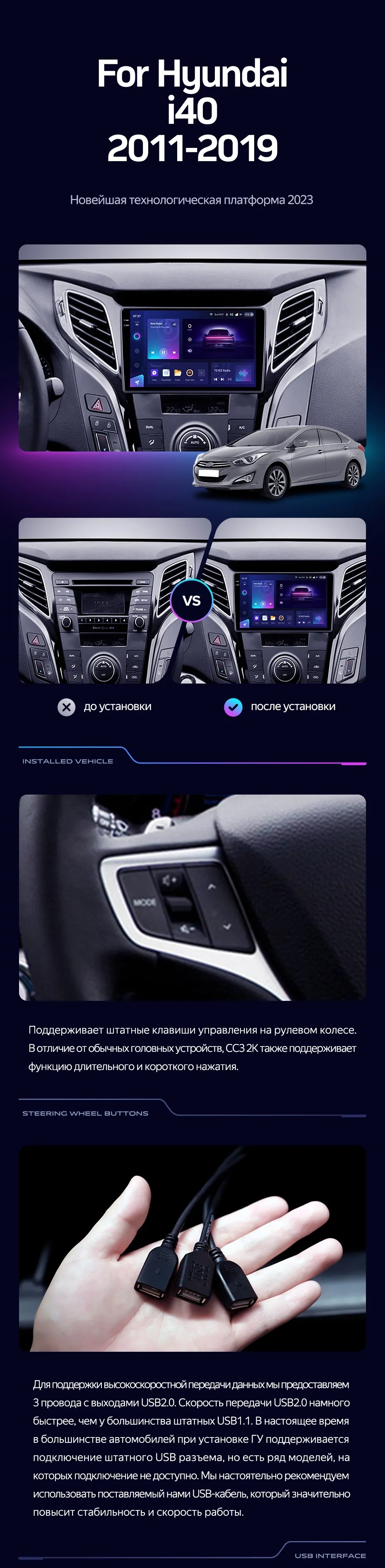 Полный комплект установки магнитолы Teyes с рамкой и проводкой можно выбрать в каталоге штатных магнитол Hyundai i40 (2011-2019).