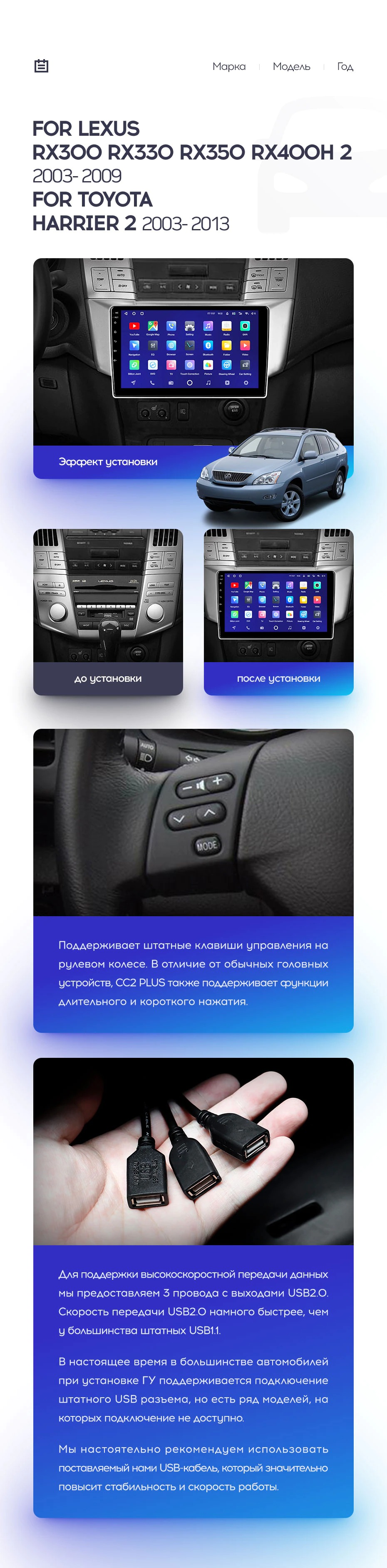 Полный комплект установки магнитолы Teyes с рамкой и проводкой можно выбрать в каталоге штатных магнитол Lexus RX300 RX330 RX350 RX400H (2003-2009).