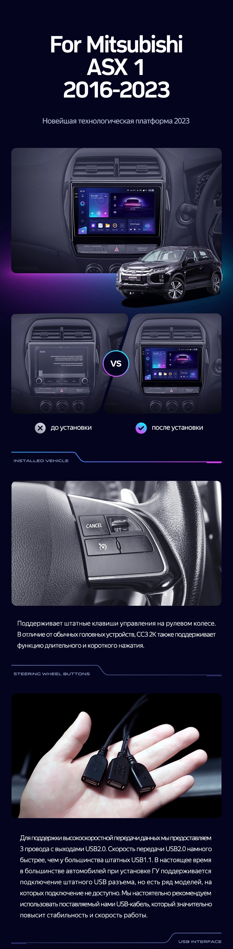 Полный комплект установки магнитолы Teyes с рамкой и проводкой можно выбрать в каталоге штатных магнитол Mitsubishi ASX (2016-2023).