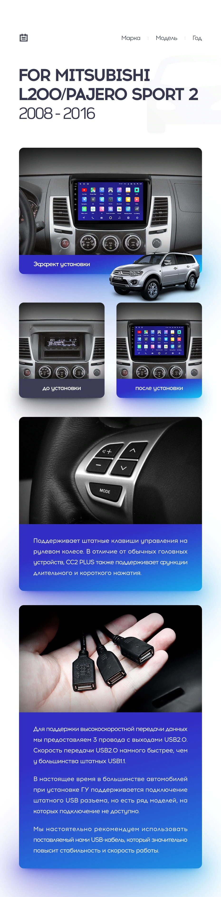 Полный комплект установки магнитолы Teyes с рамкой и проводкой можно выбрать в каталоге штатных магнитол Mitsubishi L200 (2008-2016).