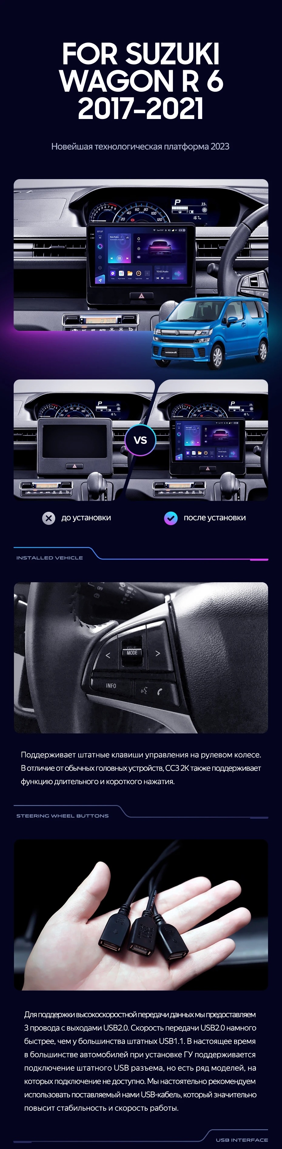 Полный комплект установки магнитолы Teyes с рамкой и проводкой можно выбрать в каталоге штатных магнитол Suzuki Wagon R VI (2017-2021).