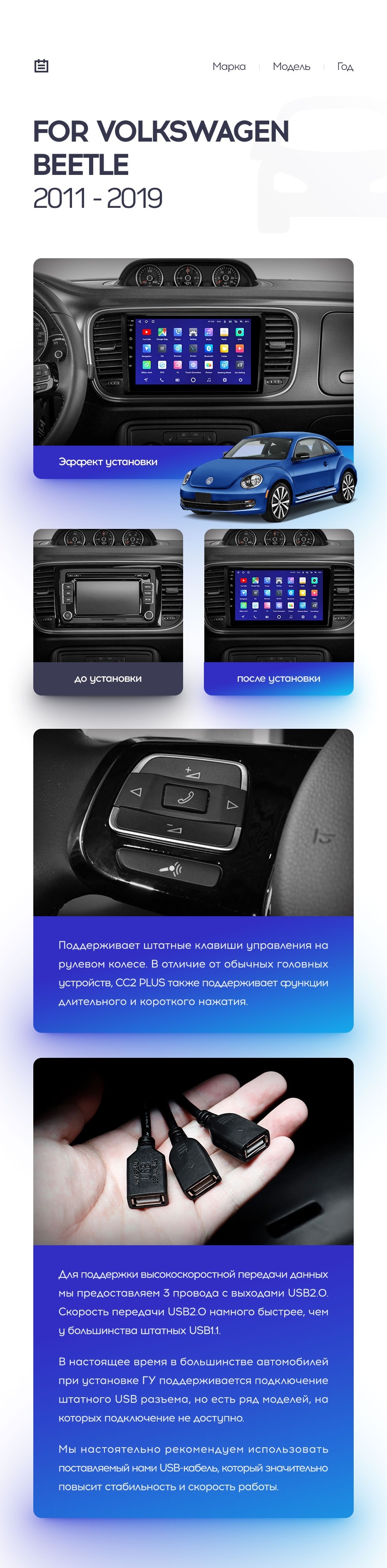 Установочный комплект для Volkswagen Beetle A5 (2011-2019) включает переходную рамку и проводку.