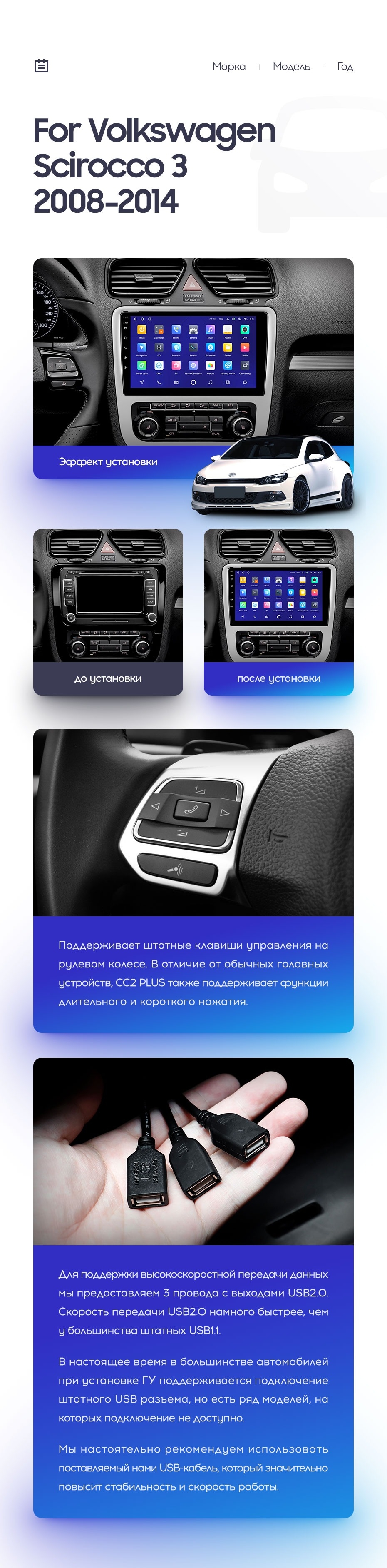 Полный комплект установки магнитолы Teyes с рамкой и проводкой можно выбрать в каталоге штатных магнитол Volkswagen Scirocco 3 (2008-2014).