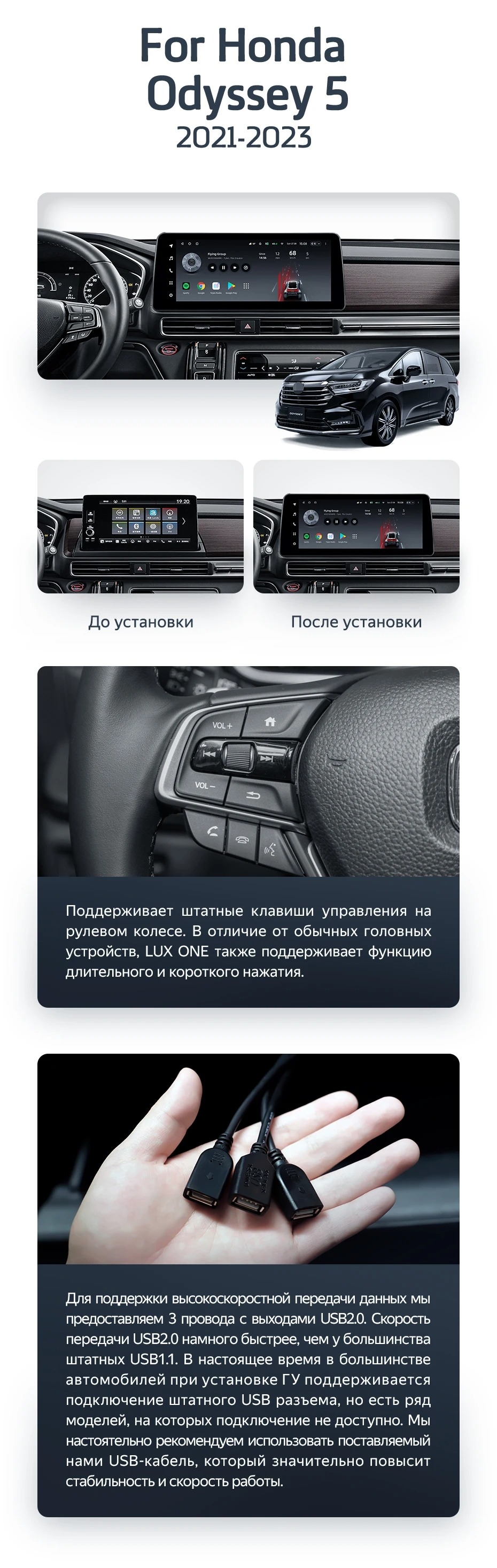 Полный комплект установки магнитолы Teyes с рамкой и проводкой можно выбрать в каталоге штатных магнитол Honda Odyssey 5 (2021-2023).