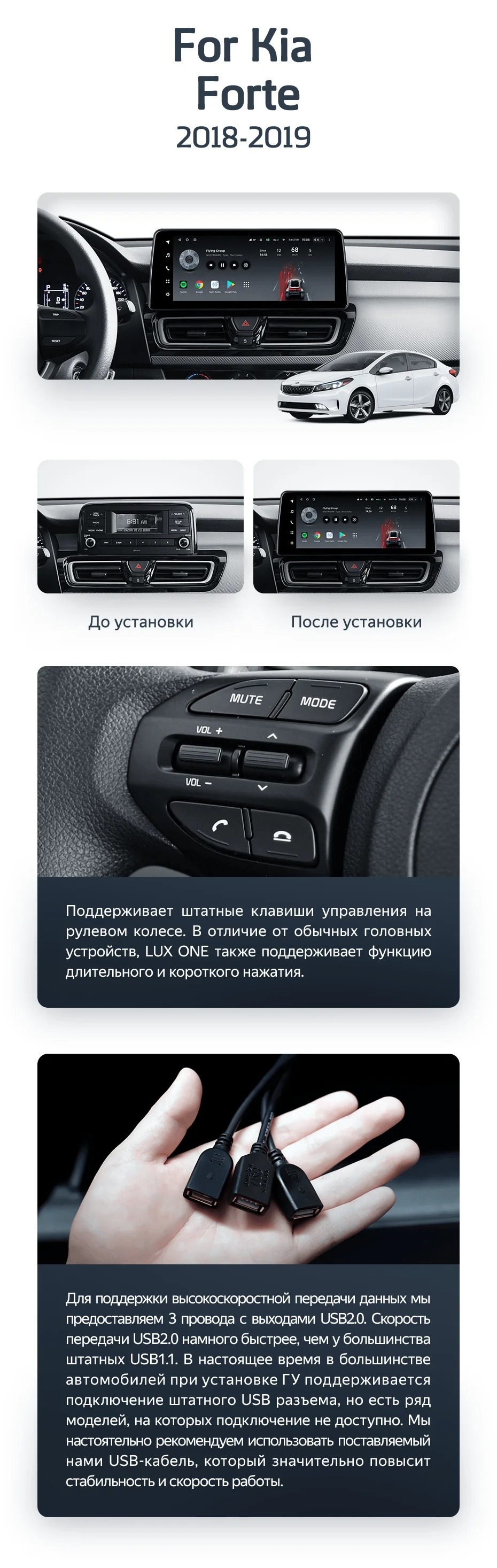 Полный комплект установки магнитолы Teyes с рамкой и проводкой можно выбрать в каталоге штатных магнитол Kia Forte (2018-2019).