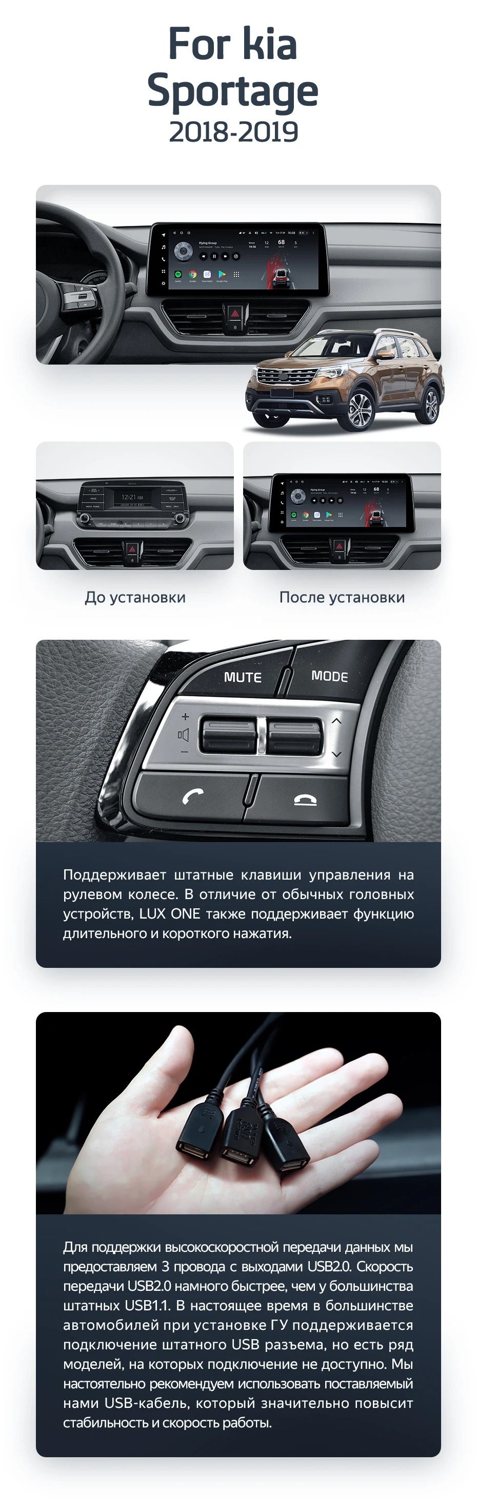 Установочный комплект для Kia Sportage (2018-2019) включает переходную рамку и проводку.